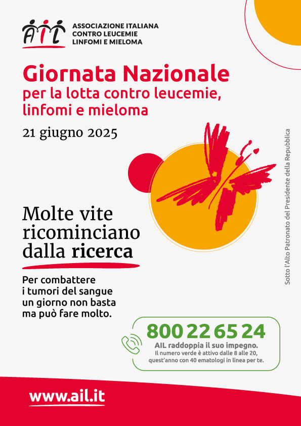 Sabato 21 giugno 2025 si celebra la 20ª edizione della Giornata Nazionale per la lotta contro Leucemie, Linfomi e Mieloma posta sotto l’Alto Patronato del Presidente della Repubblica e istituita permanentemente dal Consiglio dei Ministri. Un appuntamento importante promosso da AIL – Associazione Italiana contro Leucemie, Linfomi e Mieloma, per sensibilizzare l’opinione pubblica, raccontare i progressi della Ricerca Scientifica e supportare da vicino i pazienti affetti da patologie ematologiche, adulti e bambini.