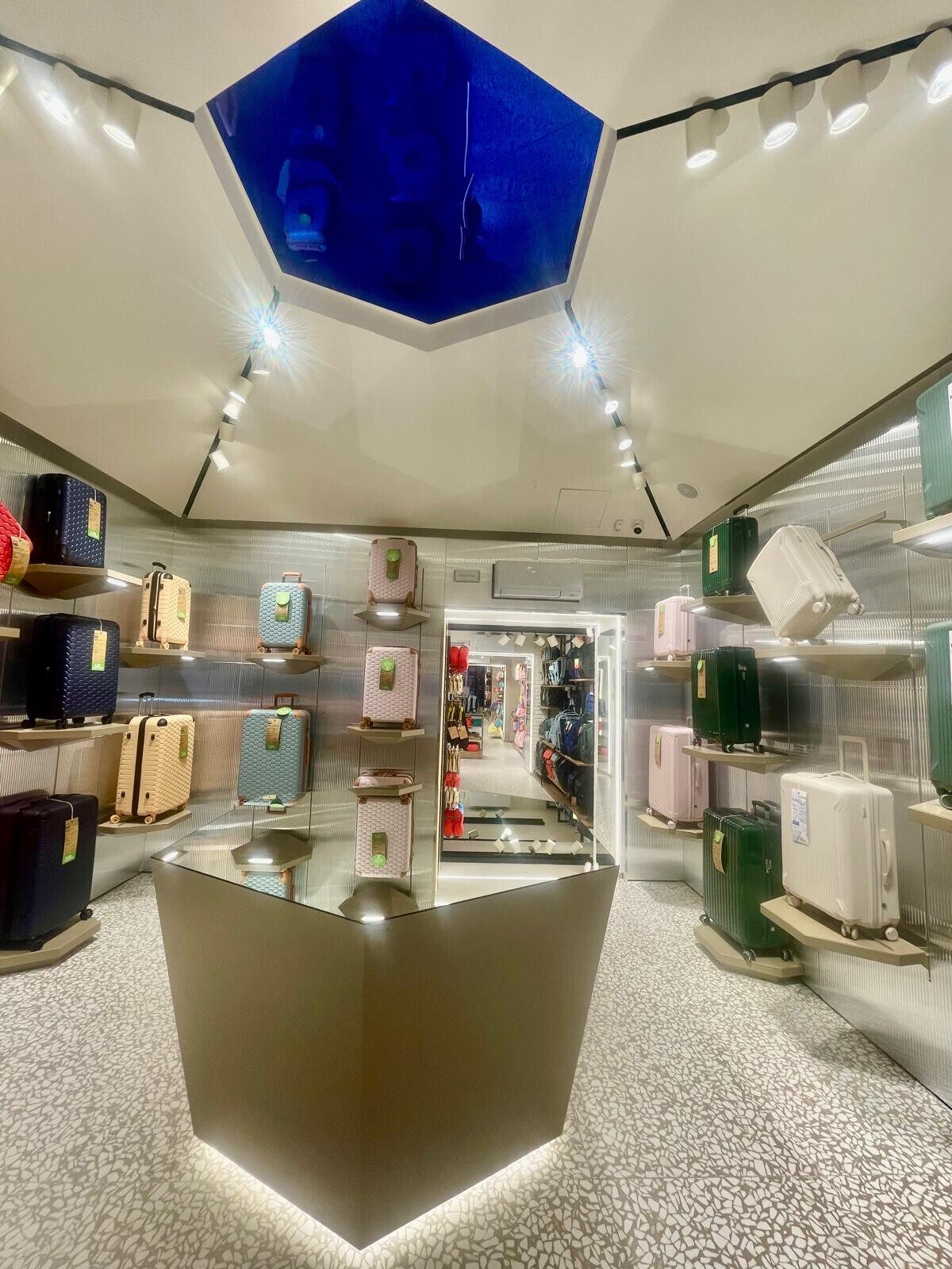 Al centro dell’ingresso, un albero digitale accoglie i clienti con immagini in movimento proiettate su uno schermo ad alta definizione. Attorno, una struttura di rami espositivi disegna un paesaggio sospeso, dove borse, valigie e accessori sembrano fluttuare come frutti da scoprire. È l’inizio di un viaggio: non tra scaffali, ma tra suggestioni.