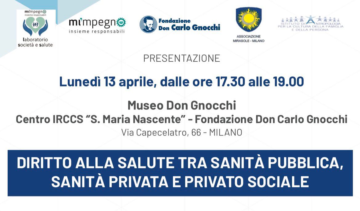 Lunedì 13 aprile alle ore 17,30 presso il Museo Don Gnocchi del Centro di ricerca IRCCS “Santa Maria Nascente” della Fondazione del Beato don Carlo Gnocchi di via Capecelatro, 66, Milano, si svolgerà l’interessante convegno dal tema: “Diritto alla salute tra Sanità Pubblica, Sanità Privata e Privato Sociale”.