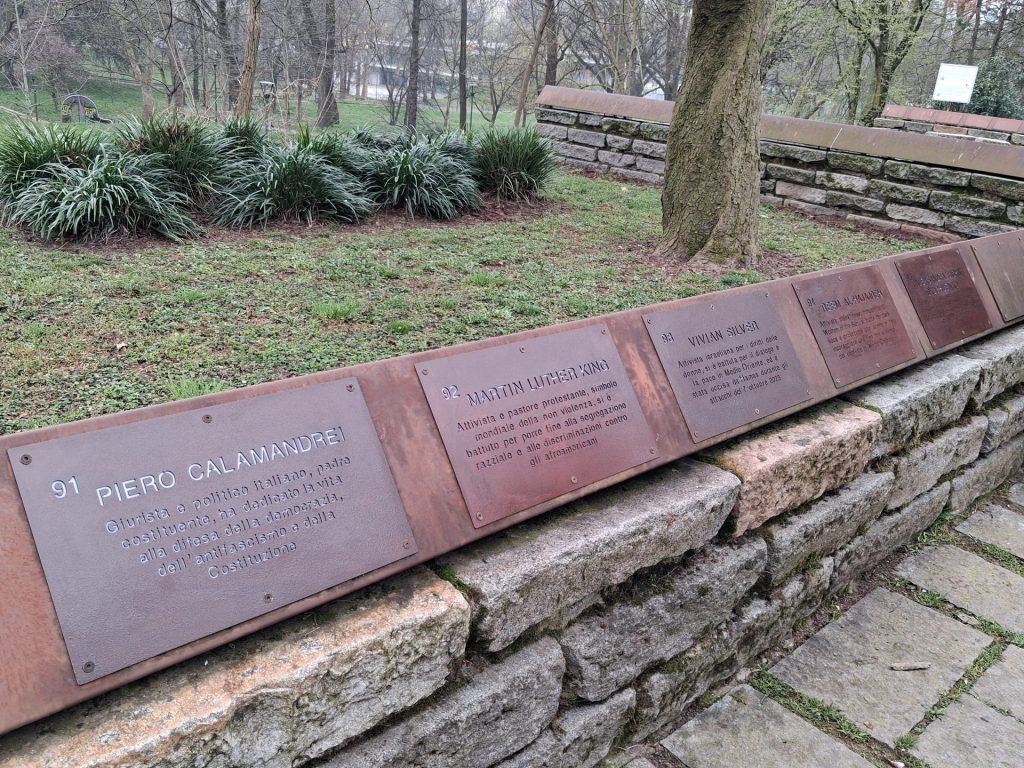 Chi sono questi 5 testimoni esemplari i cui nomi sono stati lì incisi sulle targhe a loro dedicate? sono: Piero Calamandrei, Giurista, politico, antifascista, degli anni di quel particolare momento storico italiano del secondo conflitto mondiale e ha contribuito alla stesura della Costituzione Italiana; Martin Luther King, Attivista e Pastore protestante, leader del movimento per i diritti civili degli afroamericani degli anni ’60; Vivian Silver, Attivista israeliana, si è battuta per i diritti delle donne e per il dialogo in Medio Oriente; Reem Al-Hajajreh, Attivista per la pace in Palestina e fondatrice di Women of the Sun, un’associazione di donne palestinesi che vogliono far sentire la loro voce e Aleksandra “Sasha” Skochilenko, Artista russa, Attivista, incarcerata per aver diffuso notizie sulla guerra in Ucraina.