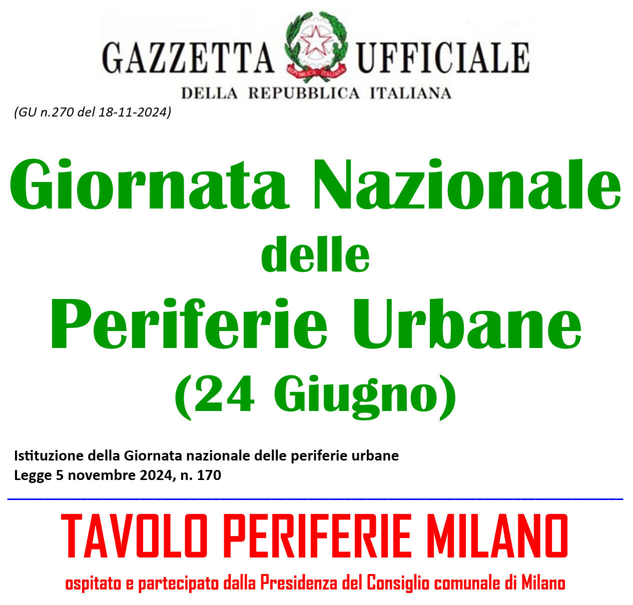 Circa la tavola rotonda, va riferito che la data del 24 giugno non è una data casuale ma è la data che la Legge n. 170 del 5 novembre 2024 ha istituita quale Giornata Nazionale delle Periferie Urbane quale la data del 24 giugno.