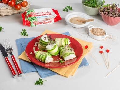 Lasciarle marinare per 5 minuti. Tamponare le zucchine con carta assorbente da cucina per eliminare l’acqua di vegetazione. Allineare tre fette di zucchina alla volta sormontandole leggermente. Farcire con un cucchiaino di Fior di Stracchino Nonno Nanni e arrotolare formando un involtino.