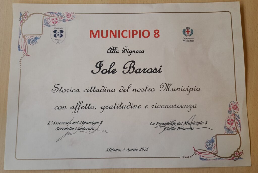 Barbalinardo ringrazia i rappresentanti istituzionali che hanno partecipato poiché abbandonano la festa per altri impegni. Da parte del Municipio 8 alla signora Iole è stato consegnato l’Attestato per questo suo particolare traguardo di 111 anni.
