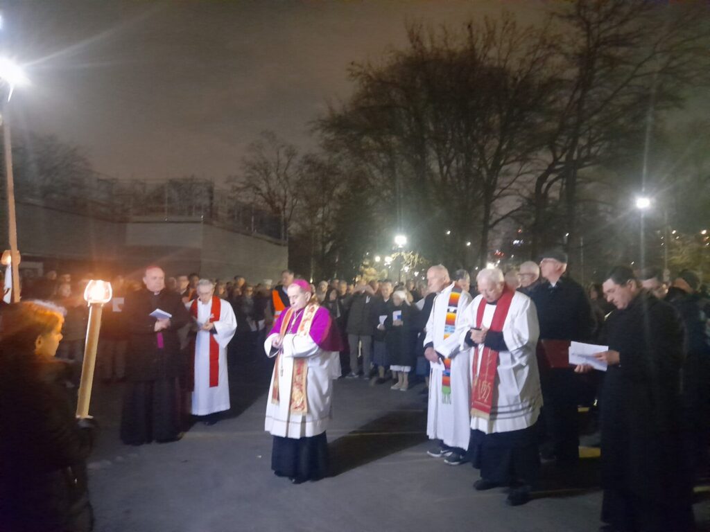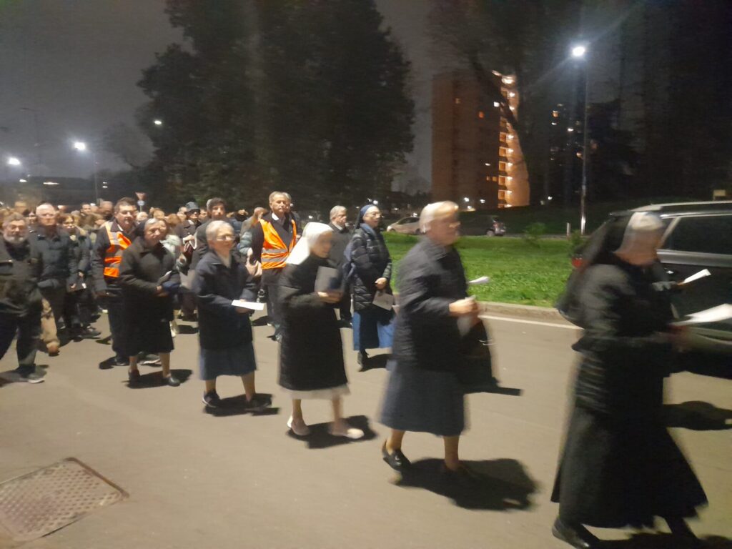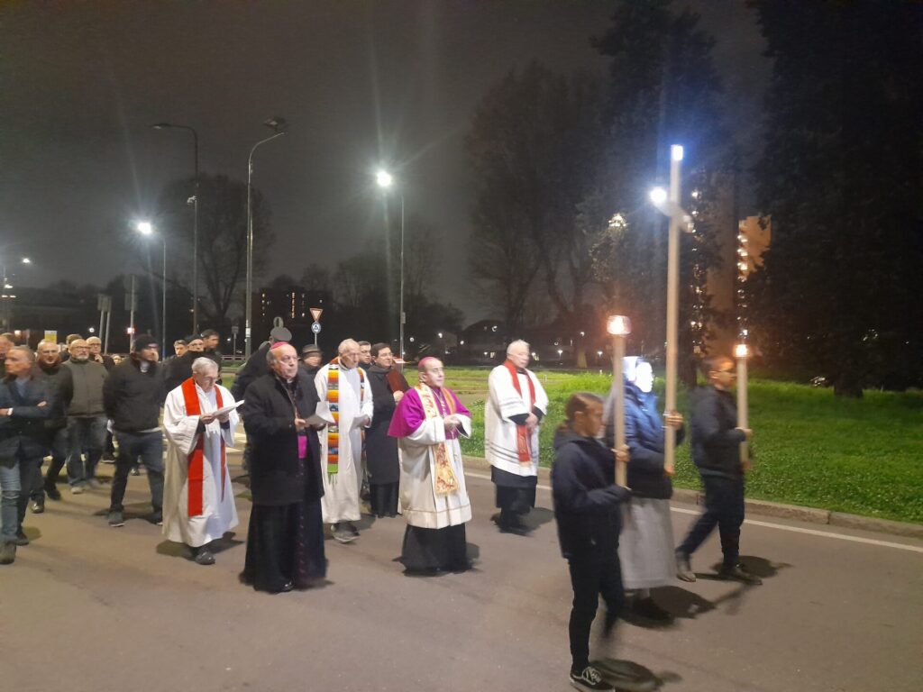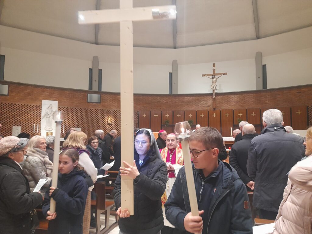 Con l’arrivo dell’Arcivescovo Monsignor Mario Delpini è iniziato il momento di fede con il canto d’ingresso, il saluto e il breve riferimento su questo anno giubilare da “pellegrini di speranza” guardando alla Croce di Gesù come alla sorgente della nostra speranza. Infatti la speranza nasce dall’amore e si fonda sull’amore che scaturisce dal Cuore di Gesù trafitto sulla Croce. E’ così iniziato il percorso della via Crucis che è uscito dalla chiesa e si è portato fino alla Prima Stazione: “Gesù nell’orto degli ulivi”, la Croce è stata portata da suor Helenia del Myanmar ex Birmania, giovane suora delle Suore della Riparazione e dopo la Croce seguivano l’Arcivescovo Delpini, i vari prelati, i sacerdoti, i religiosi, le religiose e i fedeli presenti. La prima sosta della Croce si è svolta alla fine della Piazza Santa Maria Nascente antistante l’edificio della scuola Martin Luter King, qui è seguita la lettura di un brano del vangelo di Giovanni, dopo la riflessione e meditazione. Da qui la Croce è stata portata da altri fedeli incaricati e il percorso è continuato fino all’ingresso della salita che porta al Monte Stella e si è giunti alla altra tappa della seconda Stazione: “Gesù, tradito da Giuda”, dopo il percorso è proseguito all’interno del parco fino alla dodicesima Stazione: “Gesù in Croce, la Madre e il Discepolo” con la lettura del Vangelo e riflessione sulla Vergine Maria che credette alla parola del Signore.