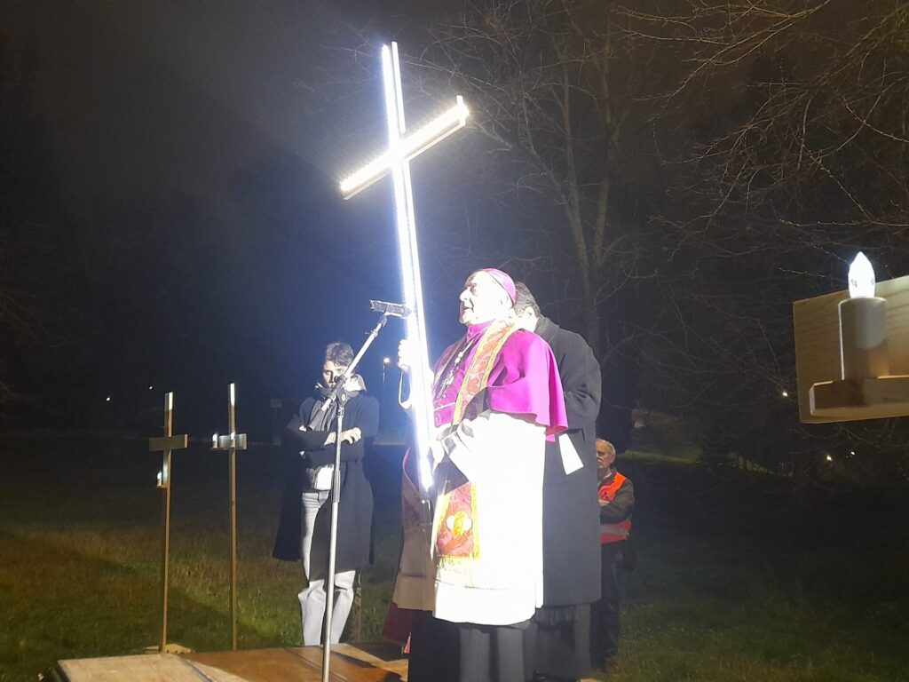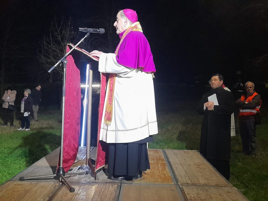 La via Crucis ha proseguito il percorso all’interno del Monte Stella fino alla spianata dove era stato allestito un palco, qui ci si è soffermati per la tredicesima Stazione: “Gesù muore in Croce”, cui è seguita la lettura del vangelo al grido a gran voce di Gesù: “Eloi, Eloi, lemà sabactàni? che significa Dio mio, Dio mio, perché mi hai abbandonato?” cui ha fatto seguito un momento di riflessione, delle invocazioni e il canto del Stabat Mater.