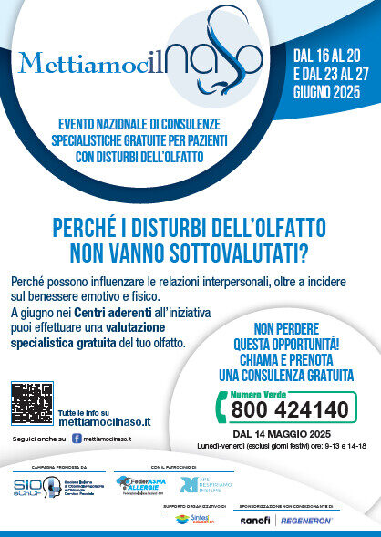 “Mettiamocilnaso”, l’evento nazionale di consulenze specialistiche gratuite per persone con disturbi dell’olfatto, prenderà il via dal 16 al 20 e dal 23 al 27 giugno in circa 30 Centri di Otorinolaringoiatria diffusi su tutto il territorio nazionale: da oggi 14 maggio 2025, fino a conclusione dell’evento, sarà disponibile un servizio di informazione e prenotazione attraverso il Numero verde 800 424140. Ogni paziente, inoltre, riceverà una guida informativa tascabile sui disturbi dell’olfatto e un questionario sullo svolgimento della consulenza e il gradimento dell’iniziativa. Tutte le informazioni sull’evento e sui Centri specialistici coinvolti sono disponibili sul sito www.mettiamocilnaso.it. È inoltre attiva una campagna Facebook a livello nazionale dedicata all’evento.