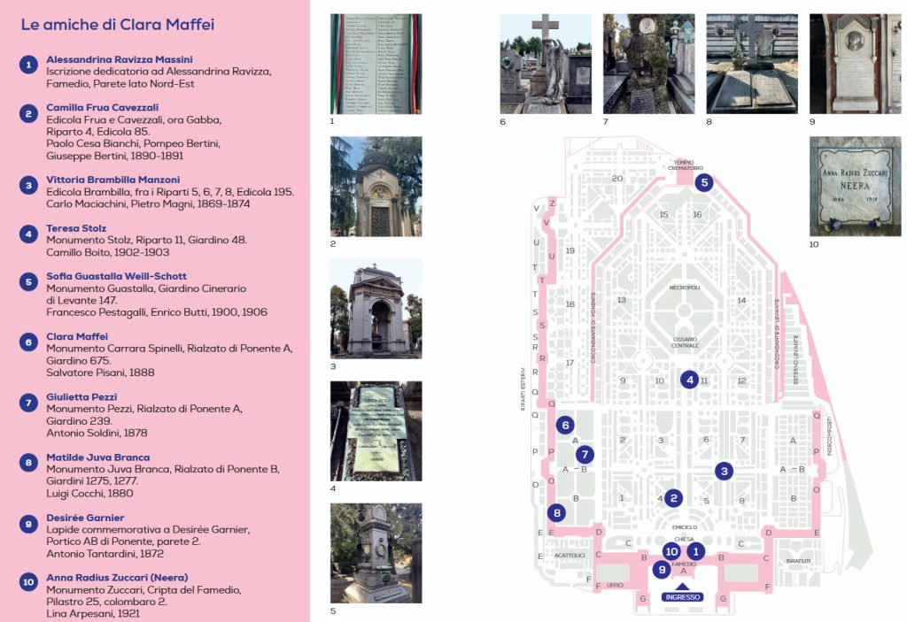 Infine, il Cimitero Monumentale – dove sono custodite le spoglie della Contessa – presenta un nuovo percorso tra i monumenti funebri delle donne che le furono amiche come Alessandrina Ravizza Massini, Camilla Frua Cavezzali, Vittoria Brambilla Manzoni, Teresa Stolz, Sofia Guastalla Weill-Schott, Giulietta Pezzi, Matilde Juva Branca, Desirée Garnier, e Anna Radius Zuccari Neera.