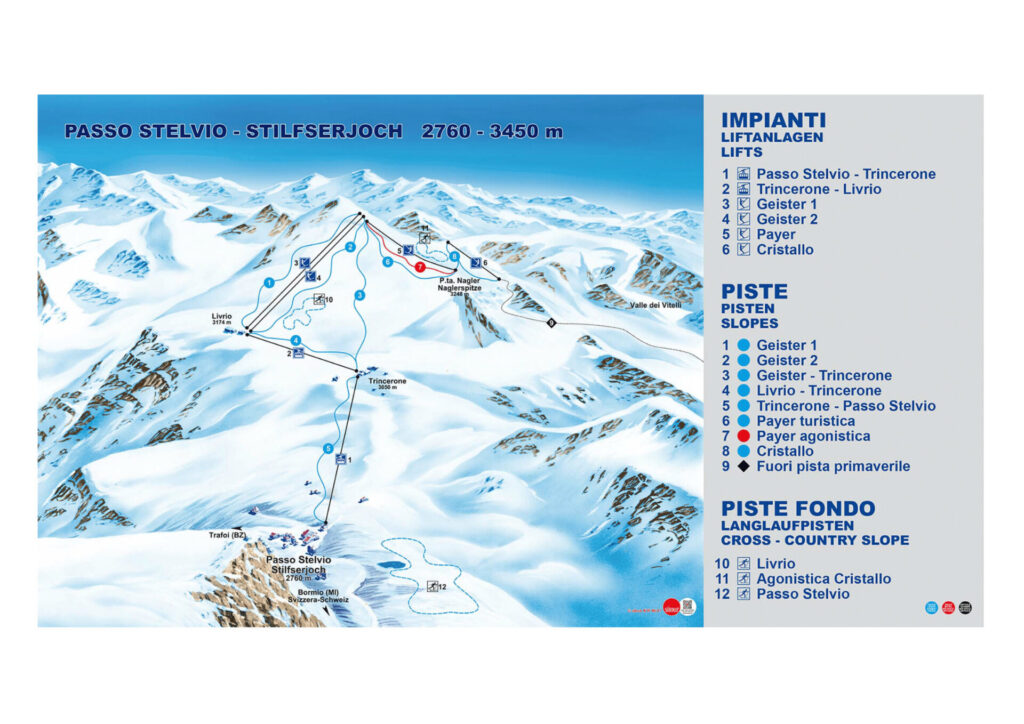 Le cronache ci informano che, presso lo Stelvio, sia presente l’unico importante ghiacciaio interamente sciabile anche d’estate malgrado, negli ultimi anni, si sia riscontrato un certo ritiro dei ghiacci, imputabile secondo gli esperti ad un lento procedere del tenore climatico, ma anche ad un diminuito apporto a chiazze di neve fresca, fattore che ha provocato il sorgere di crepacci, peraltro opportunamente segnalati da coloro che sono addetti alla sicurezza.
