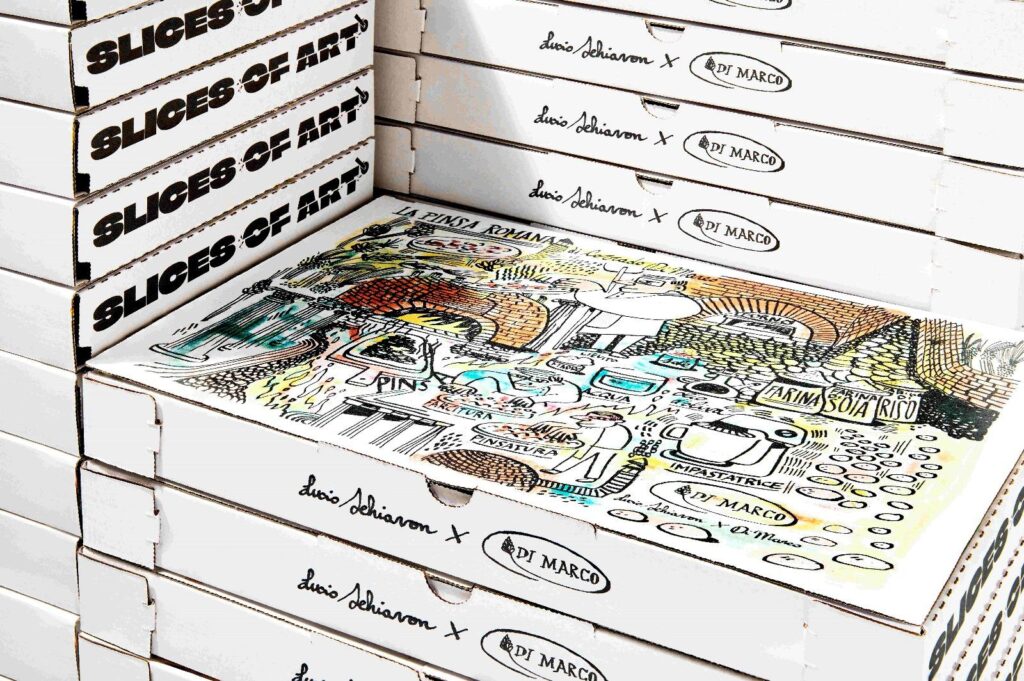 E per ottenere questo “scrigno” ideale è stata avviata la collaborazione con tre dei più noti street artist italiani – Camilla Falsini, Lucio Schiavon, Daniele Tozzi- per far sì che la migliore street art potesse vestire il migliore street food. Nasce così la “PBox”, una tela contemporanea, che oltre a racchiudere un’opera d’arte, la Pinsa, racchiude la creatività e lo stile degli artisti che ne hanno reinterpretato la storia e i valori attraverso la loro arte.